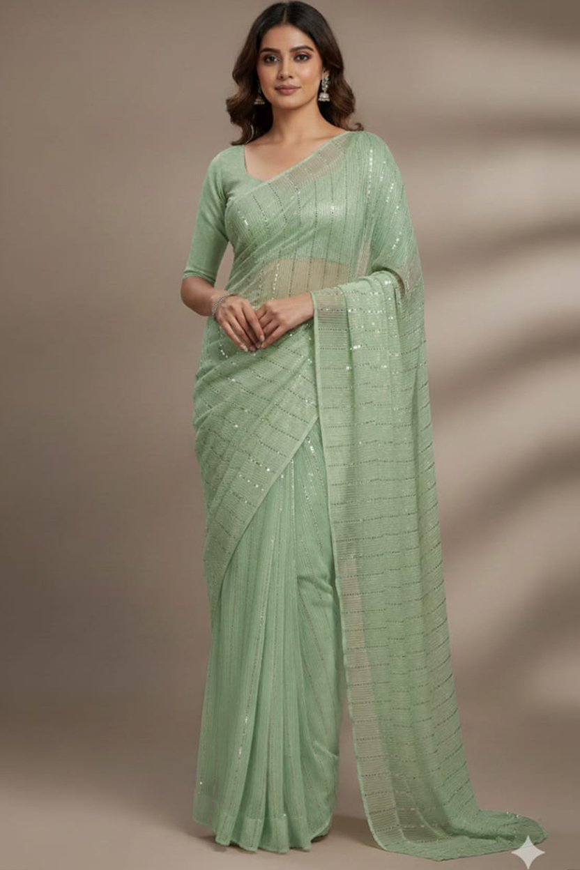 The classic Light Green Moon Light Saree adds a modern yet timeless charm, while the elegant design enhances your silhouette with subtle grace. Pair it with statement jewelry and heels for a complete, polished look that turns heads wherever you go.